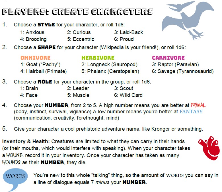 | Tags | Action-Adventure, Dinosaurs, Fantasy, lasers-and-feelings, No AI, One-page, rules-lite, Tabletop role-playing game |