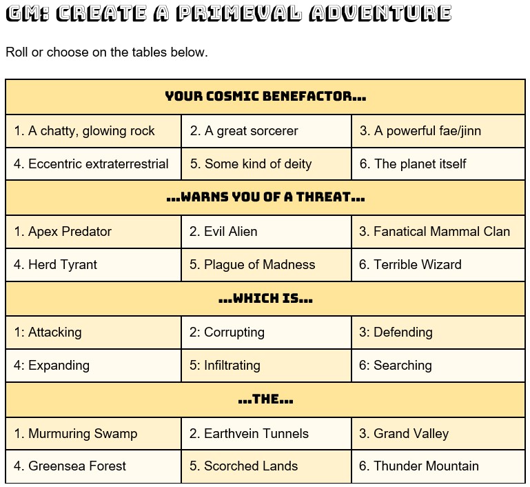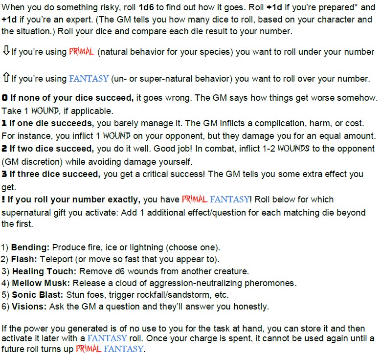 PRIMAL FANTASY is a prehistoric hack of John Harper's oh-so-fertile TTRPG Lasers and Feelings, well-suited for low-prep one-shots or brief campaigns with 2-5 players and a handful of six-sided dice.